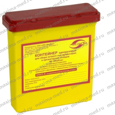 Контейнер для сбора медицинских отходов применяется в процедурных, операционных, лабораториях, на машинах скорой помощи, фельдшерских пунктах и пр. для сбора отходов, не подлежащих сбору в мягкую тару (пакеты).