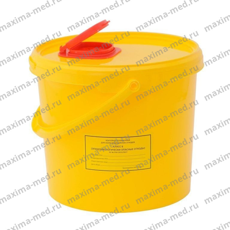 Контейнер для сбора медицинских отходов применяется в процедурных, операционных, лабораториях, на машинах скорой помощи, фельдшерских пунктах и пр. для сбора отходов, не подлежащих сбору в мягкую тару (пакеты).
