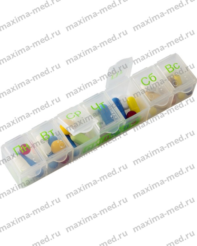 Контейнеры предназначены для расфасовки и хранения таблетированной продукции: лекарств, витаминов и т.д. Удобные и компактные контейнеры могут использоваться дома, в дороге, а также в условиях стационара. Состоит из семи отделений, которые соответствуют дням недели.