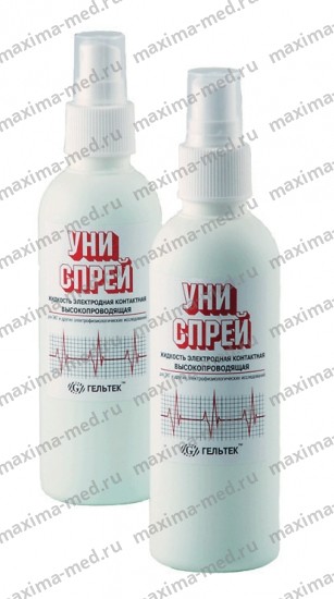 Жидкость электродная контактная с высокой электропроводностью для ЭКГ, дефибрилляции, электромиостимуляции, маммосканирования методом измерения электросопротивления тканей. Является универсальным экономичным электролитом, позволяющим оперативно проводить диагностические исследования. Униспрей рекомендуется к применению при проведении ЭКГ выездными бригадами скорой и неотложной помощи, так как не требует удаления с контактной поверхности электродов. Униспрей наносится непосредственно на тело пациента, обеспечивает хороший контакт электрода с телом пациента. После проведения исследования Униспрей легко удаляется салфеткой. Униспрей не пачкает одежду, не вызывает аллергии, не портит электроды, водорастворим.