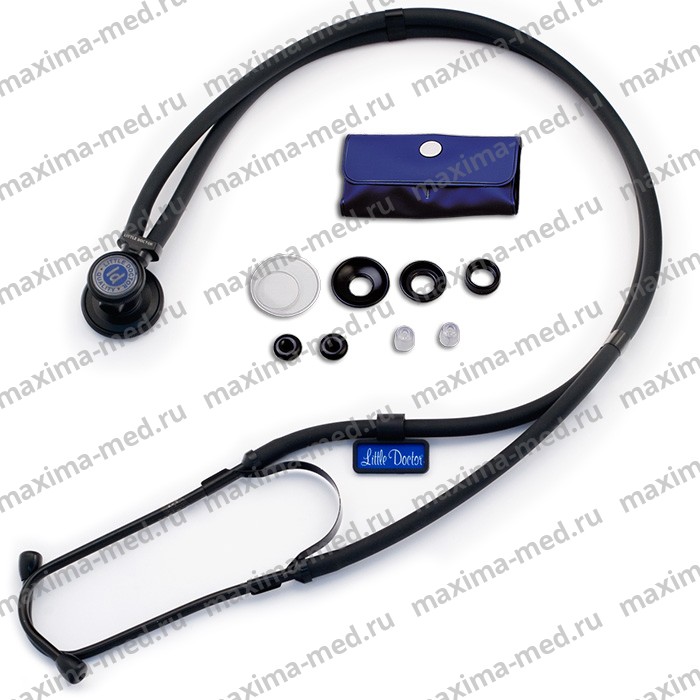 Дополнительные насадки в комплекте: пластиковый колокол большой (диаметр 33 мм), пластиковый колокол малый (диаметр 26 мм), пластиковый колокол неонатальный (диаметр 19 мм), мембрана большая (диаметр 40 мм), мембрана малая (диаметр 27 мм), пластиковые наконечники для ушей (твердые и мягкие), пластиковая сумочка для дополнительных принадлежностей.Длина трубок: 56 см.