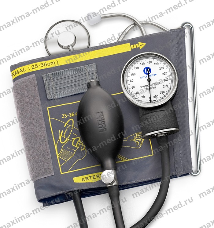 Тонометр механический предназначен для измерения уровня артериального давления. В комплекте имеется металлический стетоскоп, нейлоновая манжета для окружности плеча 25-36 см с металлическим фиксирующим кольцом, манометр с нагнетателем и удобная сумочка для хранения тонометра.