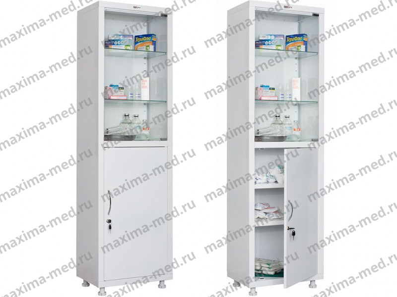 Шкаф медицинский металлический предназначен для размещения и хранения лекарственных препаратов (медикаментов), перевязочных материалов, шприцев, инструментов, лотков и других медицинских изделий. Шкаф выполнен из листовой стали толщиной 0,8 мм с нанесением экологически чистого полимерного покрытия, устойчивого к дезинфицирующим средствам. В верхней части: стеклянная дверца с магнитной защёлкой и две стеклянных полки. В нижней части: запираемая металлическая дверца и две металлических полки. Установлен на регулируемые винтовые опоры.