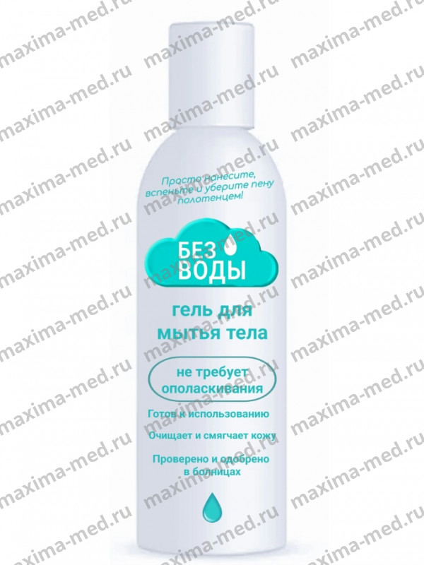 Гель для мытья тела «БЕЗ ВОДЫ». Бережно очищает кожу, не требует смывания водой. Позволяет полноценно очистить кожу и избавиться от запаха. Поглощает загрязнение. После стирания полотенцем остатки распадаются, не оставляя следов. Без содержания спирта.