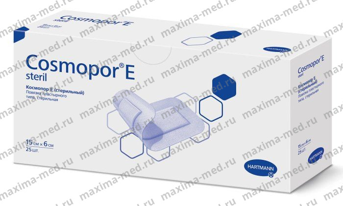 Самоклеющиеся стерильные повязки Космопор Е Стерил (Cosmopor E Steril) выпускает фирма Paul Hartmann (Испания). Показания к применению: повязки Cosmopor E Steril могут применяться при незначительных повреждениях кожи в качестве фиксирующего средства для других лечебных повязок, а также как самоклеящаяся послеоперационная повязка.