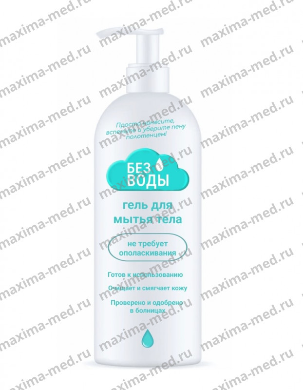 Гель для мытья тела «БЕЗ ВОДЫ». Бережно очищает кожу, не требует смывания водой. Позволяет полноценно очистить кожу и избавиться от запаха. Поглощает загрязнение. После стирания полотенцем остатки распадаются, не оставляя следов. Без содержания спирта.