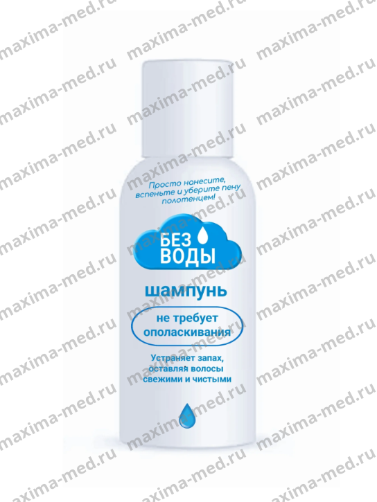 Шампунь для мытья волос «БЕЗ ВОДЫ». Предоставляет возможность помыть голову быстро и без использования воды. Подходит для вех типов волос. Не требует смывания и ополаскивания. Без содержания спирта.