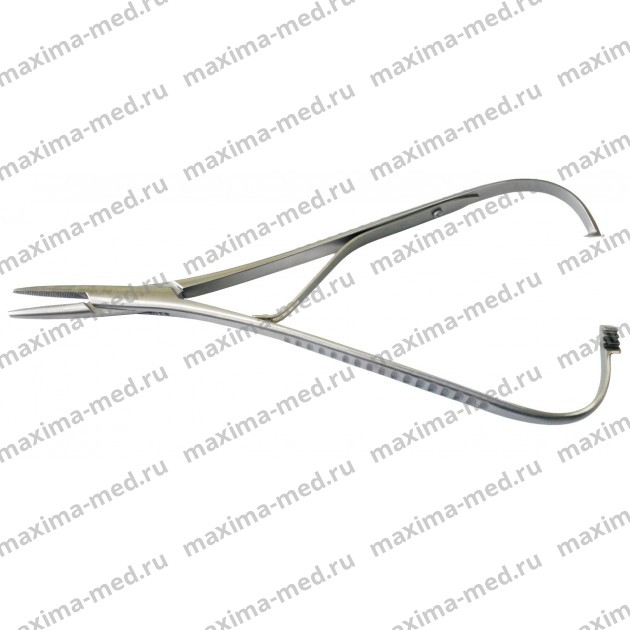 Иглодержатель по Матеу предназначен для проведения хирургической иглы через ткани при наложении швов. Он снабжен пружинистыми рукоятками и кремальерным замком, который размыкается при дальнейшем сжатии рукоятки.