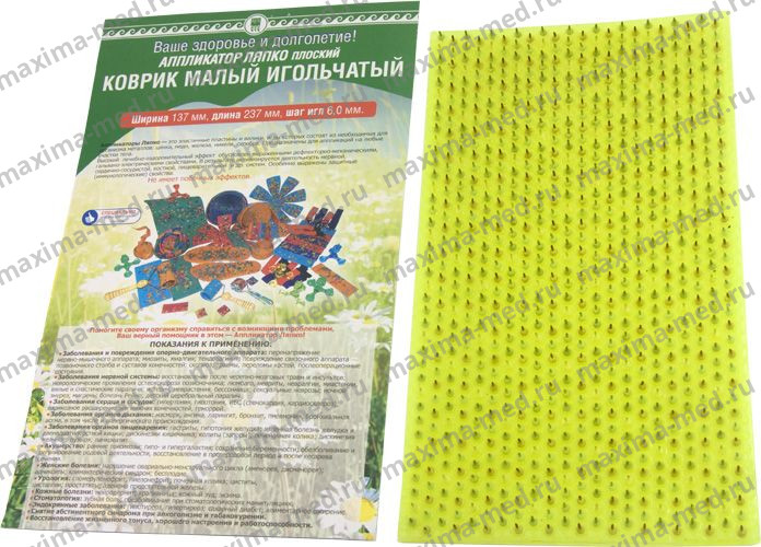 Аппликатор коврик Ляпко малый на силиконовой основе является разновидностью коврика Ляпко малый только в отличии от него за основу берётся не резина, а силикон, что делает его более долговечным, а также силиконовая основа практически не имеет посторонних запахов. Коврик Ляпко малый имеет тот же состав игл, включающих в себя сплав металлов серебра, цинка, никеля, меди и железа, в совокупности оказывающих лечебное и профилактическое воздействие на различные органы и весь организм в целом. Благодаря небольшому размеру 237 х 137 мм, и небольшому шагу иглы, 6,0 мм. силиконовый коврик Ляпко малый позволяет применять его людям любого возраста, а также на частях тела с меньшей площадью, то есть локально. Этот вариант коврика Ляпко более компактный и удобный при транспортировке, так как имеет малый размер и занимает меньше места в дорожной сумке. Но эффект лечебного воздействия его размер и шаг иглы нисколько не уменьшает, а наоборот, расширяет области применения.