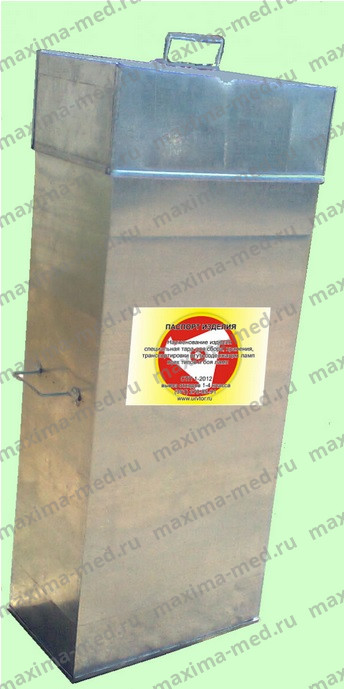 Транспортная тара для сбора, хранения и транспортирования ртутьсодержащих ламп (боя) представляет собой металлический контейнер прямоугольной формы с закатным дном, съемной крышкой, изготовленный из листовой холоднокатаной оцинкованной стали. Для переноса, разгрузки и погрузки на таре установлены две складывающиеся ручки.