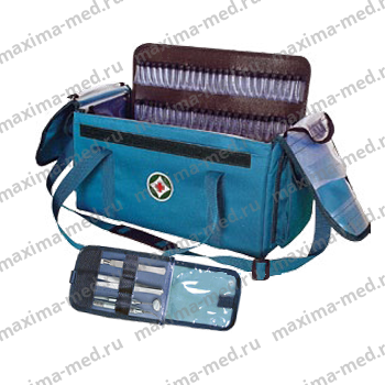 Для удобства использования и хранения медицинского инструмента внутри сумки располагается специальный планшет для хирургического инструмента. На крышке сумки располагается карман для перчаток и халата. С внешней стороны сумки на боковых стенках расположены объемные накладные карманы для перевязочного материала.