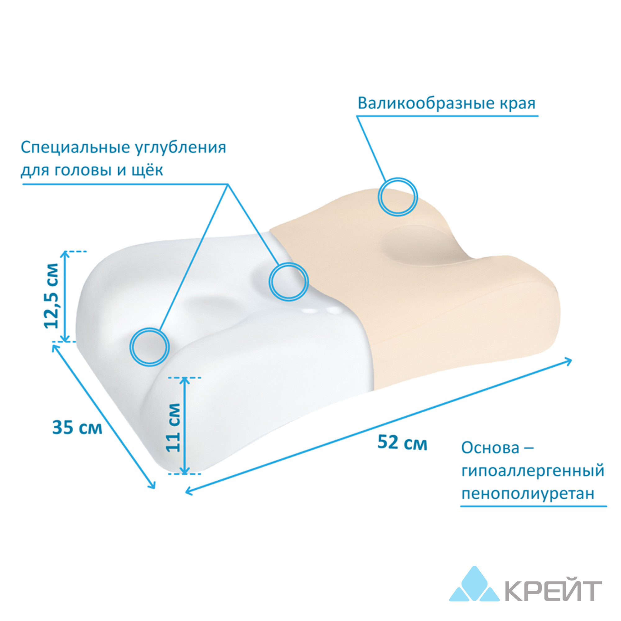 Обеспечивает более свободный кровоток в затылочной части головы во время сна на спине. Помогает позвоночнику оставаться в правильном физиологичном положении даже во время сна на боку. Предупреждает формирование новых и развитие имеющихся морщин. Перераспределяет типичное давление на кожу лица, чем и препятствует появлению отёков и заломов на коже лица после сна.