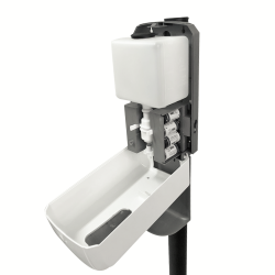 Стойка с автоматическим дозатором для дизинфекции; 1,4 метра, 10 кг, стальная труба, круглое дно, цвет черный. Дозатор работает от 4-х батареек тип C (в комплект не входят)